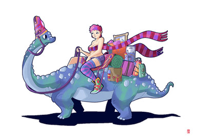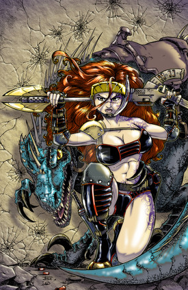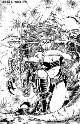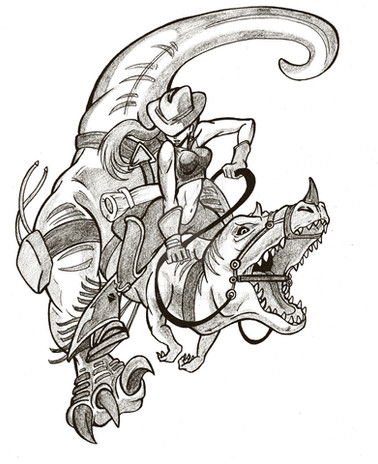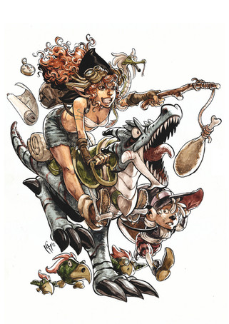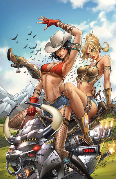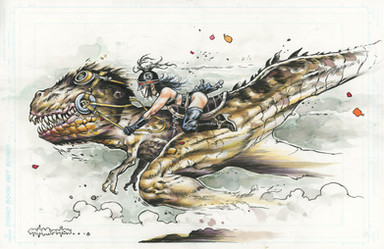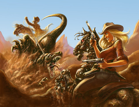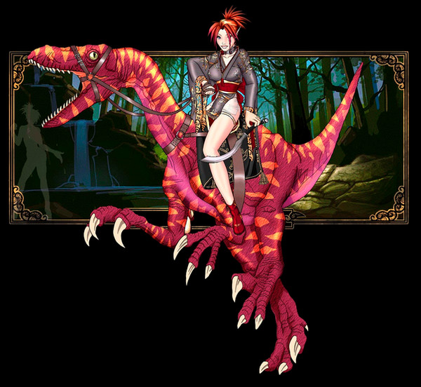 Excellent art work. The female character looks very hot and sexy. Also the dinasaur and the mascots together with all those mechines is very sureal. Well done!