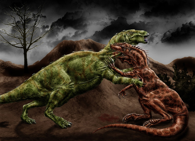 Well itβs triassic art and raptors havenβt evolved yet so theyβre probably coelophysoids