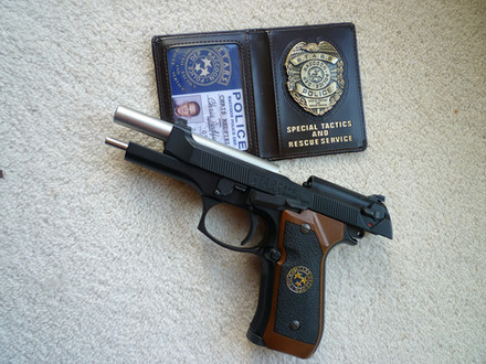 This is my custom ID wallet with badge and card, and my Beretta M92F. I am trying to make Wesker's Samurai Edge. The grips and slide from the official Edge came up on ebay here so i got them. As i am in the UK and dont have a license to have an airsoft gun that looks realistic, i had to buy the 2 tone Beretta which i got here: [link] I have been working on it and have encountered a few problems. Firstly the grips. The left hand side goes on as the photo, however there is a slight gap. The right hand side wont go on at all because the holes in the grips dont match up to the holes in the gun (for some reason the right side grip has the top hole lower down than the left side, if it was the same then it would fit) so i will either have to get a new hole drilled into the gun that is tapered so it will hold a screw in or just glue it on or something which i dont really want to have to doYou will probably also notice that the slide is not on correctly. This is the second issue. The blue one that came with it when i try to put it back on the slide pulls back with the spring like its suppost to. When i put on the STARS one however it doesnt and i cant get it to go on at all. I can get one side almost on which is shown in the pic however the other side is way out. I dont know how im going to get this to go on..