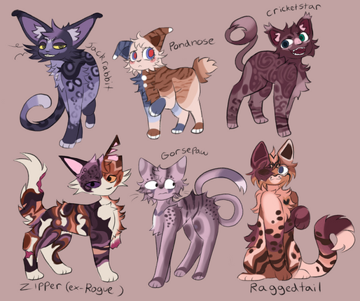 Uhh some design notes (not like he doesn't have plenty on the sheet already): he's based a fair amount off of a tiger and his stripes+head show it the most; I made him a lot less saturated than his half-siblings to make him sort of "ashen" but also because his father is gray; it was harder to decide where his fire-stripes were going because his isn't a classic tabby, marbled, or rosetted; I associate him with gold but didn't really put that in his design anywhere; no he is not Brambleclaw but he may as well be.