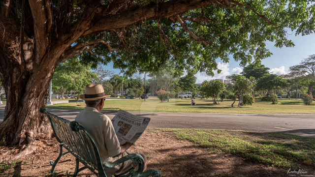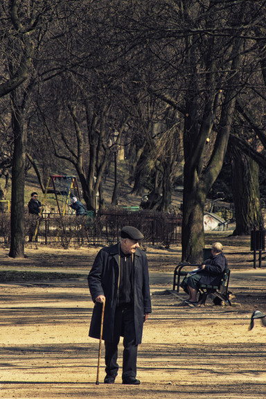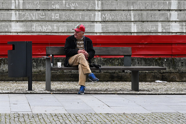 Cool angle of view! Looks like you lay on the ground with some big tele lens mounted while the man on the photo is wondering what you're doing there