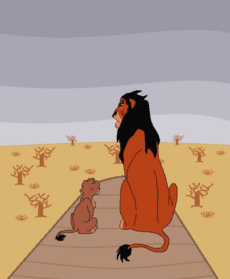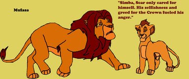 I think this little banter between the "offical" version of Ahadi and Taka in TLK 6NA: A Tale of Two Brothers does a pretty good job of showing how my version of Ahadi and Taka tend to interact on a daily bases, up until Taka receives his scar. Ahadi isn't nessicarily an abusive parent, per say, but he tends to neglect Taka while showering praise and favor upon Mufasa. He tends to off-handedly compare the two as well, saying things such as "Mufasa can do _____, why can't you?" or "Mufasa understands _____, why don't you?" or "Mufasa is _____, why aren't you?" He also tends to break his promises to his younger son often, often coming up with excuses to avoid him (although in this instance he actually has a valid excuse: settling the arguments between the subjects during the drought before things get nasty, while Uru is off finding water). And then there's his short temper, which often causes him to snap at Taka when he doesn't intend to. Both his sons will inherit his short temper, though Taka to a slightly lesser degree than Mufasa (in other words Mufasa, like Ahadi, is more likely to get physical than Taka). In the end, Ahadi is more neglectful than abusive.