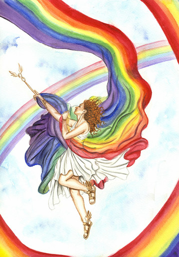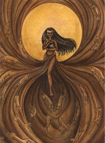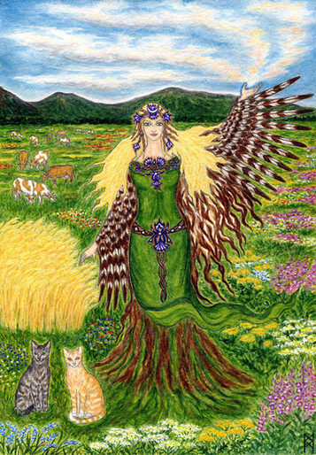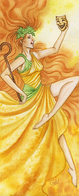 Demeter, the kind Greek goddess of vegetation and the fields. As the mother of Persephone, Demeter withholds her nourishing gifts in the months her daughter spends in the Underworld, and allows the world to burst into bloom each year upon her return. I've shown her fondly surveying her fields and orchards as she tenderly cradles some ears of early harvest corn.Related content