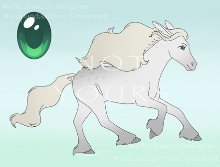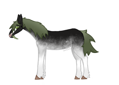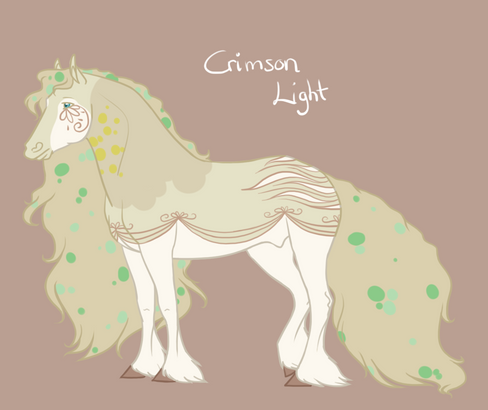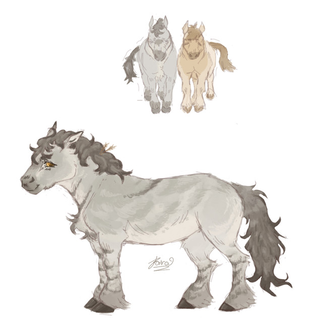 Appearance: An older grey mare with a fading blonde mane/tail, feathered hooves, and a speckling of grey spots. She has unusual green/blue eyes that are subject to glow occasionally in this form, as well as a dark ‘beauty mark’ under her right eye
