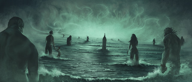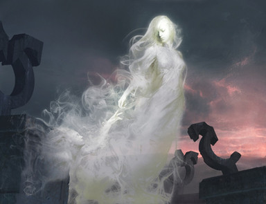 Your portrayal of spiritual substance is interesting in balance b/w solid & aether feel, with darker weight "swimming" inside the spiritual figures. (Most tend to realize such as airy spectres or transparent people so your version is something fresh ) Material bodies blended with earth not only evokes our elemental "roots" alongside water (the spirits) but reflect near-unlimited malleability just as with human body. Smooth yet firm healthy curves and contours for the central girl help confirm this alongside other "conflicting" counterparts in the distance, a cornucopia of health in zenith (amped more with the soft light glazes from the spirits onto her skin).