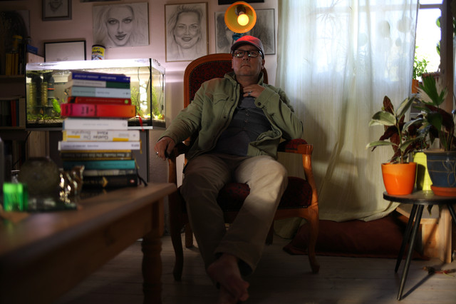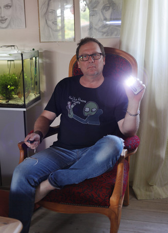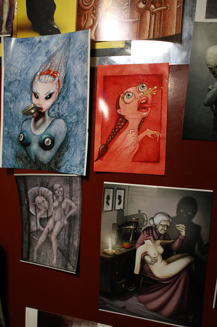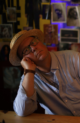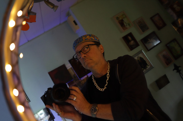 Selfie shooting randomly today ...Posed there in my kind of home creative graphically space. Chucks and hat on, that tee haha overweight and fresh shaved (redish face) ...that whole room is paved with photographs btw, kind of makes it tighter, I got that feeling. On the right, main queen in Lederhosn and a snippet of the stuff I just like, kind of a overdone, crazy deco.Β