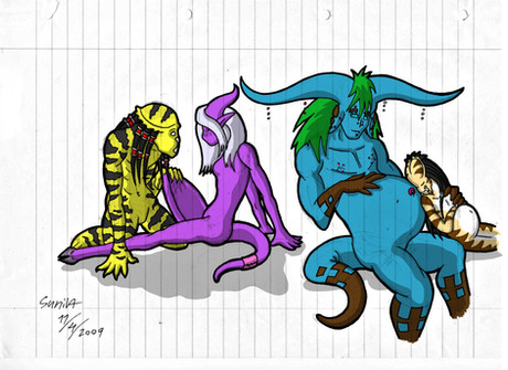 I've settled on calling this girl Zita. She's also Nona's sister and a spiritualist and athlete of sorts in contrast to Nona's love of science and sleeping in.The man is Koronu and the shadow warrior on the right is yet unnamed.