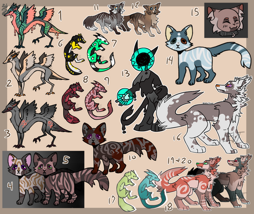 Mi_lines for the cat with a bandanna, bat, eastern dragon, sergal and vaporeon.