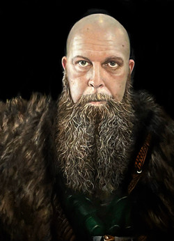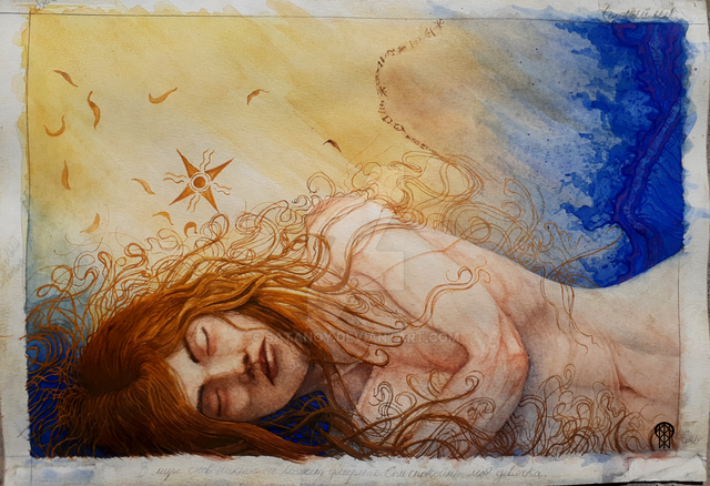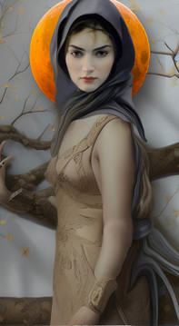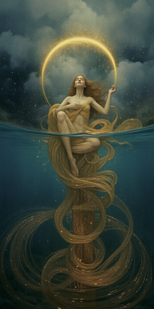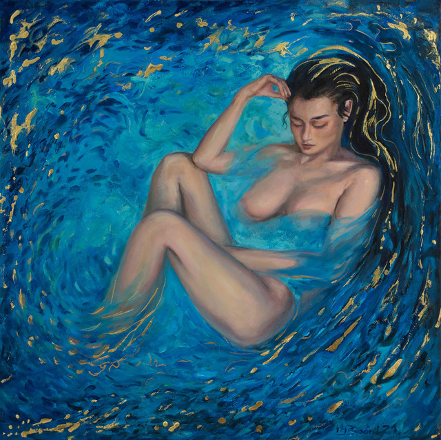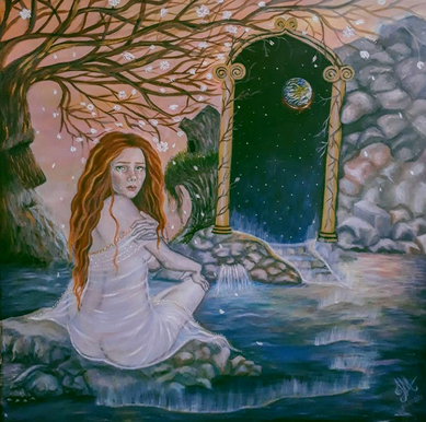 Andromeda was presented as a sacrifice to the sea monster, Cetus. Perseus rescues her, marries and makes her Queen of Greece. This painting is loosely based on that myth.-oil on panel, 48x24”