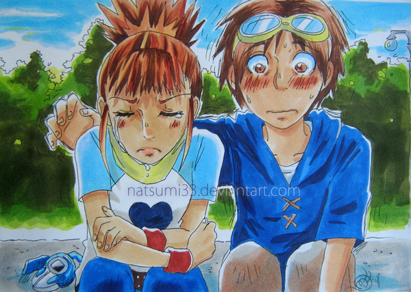 Damn this pic took soooo long. But at least I now have a Digimon pic that doesn't totally suck... not totally. Anyway, I don't even remember where I got the idea for this really. That Characters are, as usual, my favouritees from Digimon season three, in my oppinion but of all the series', Takato and Ruki (Rika whatever)The faces were a rteal treat, especially getting them the same size and all. I think I spent two days on the lineart for that alone. As well I did some shine testing infulenced by my Art Teacher. Most of this is on with the paintbrush, bu the goggles and headphones are are done in a way that closer resembles cell shading. Also, good owes to me for now hacking out any old BG. Actually it was surprising easy once I realize I didn't need to over do things. I hope you all like it and Digimon Forever... NOT SEASON FOUR.