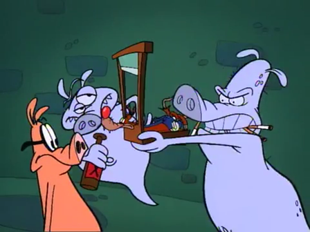 Cloud 9 is summoned because these two asshole cats tricked Fraidy into saying the number just to get a rise of out him, and aside from some very poorly done slapstick, they don't really suffer for this. The really weird part of this is that even when Fraidy's other lives are present (such as Elephunt Cave "One" Cat and his pet Apatosaurus Ant), they don't really seem to care about Cloud 9's presence and don't really care about helping Fraidy at all; instead, they seem ambivalent to Fraidy entirely, just wanting to hurt the guy. And the weird thing is none of the lives even remotely resemble Fraidy at all, despite being his own lives. I think what they were going for is that Fraidy has been reincarnated through history and that's what these ghosts represent, but it isn't well conveyed, and I feel they should more represent how each of them died.