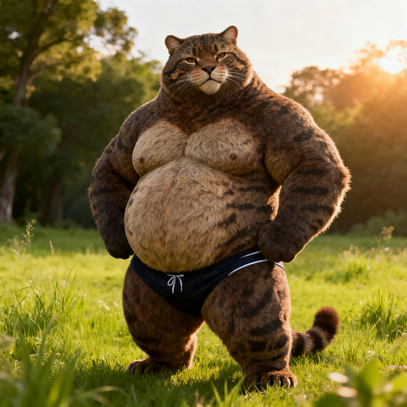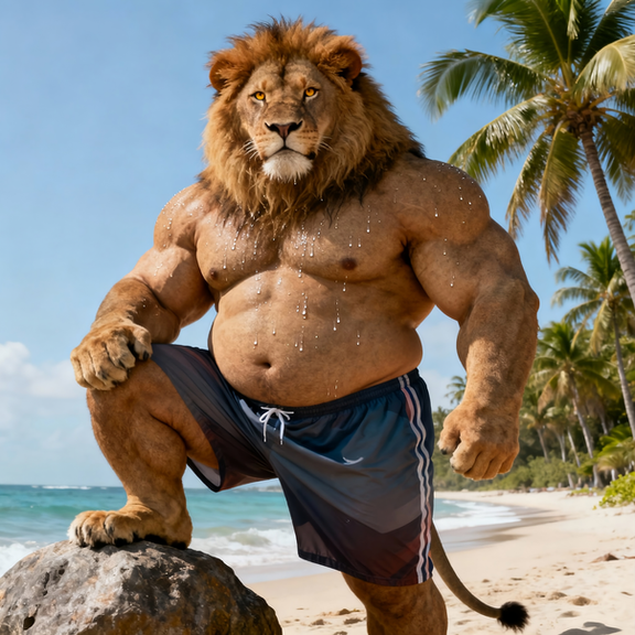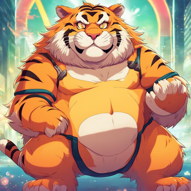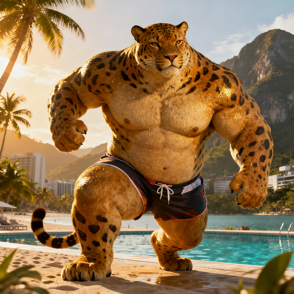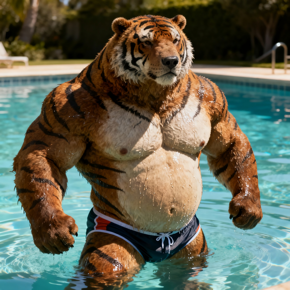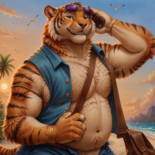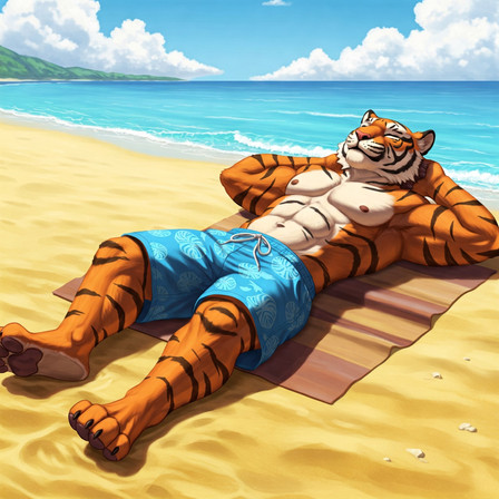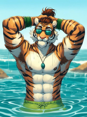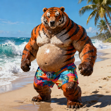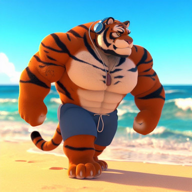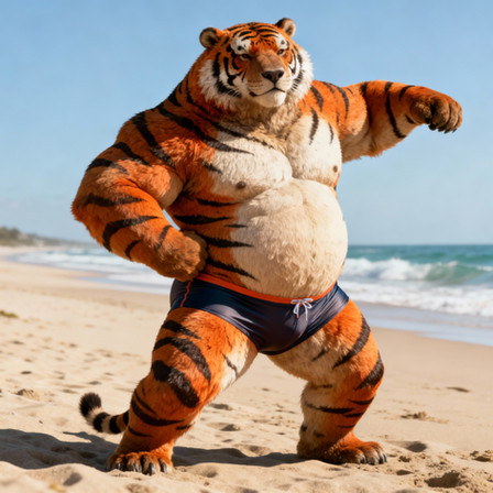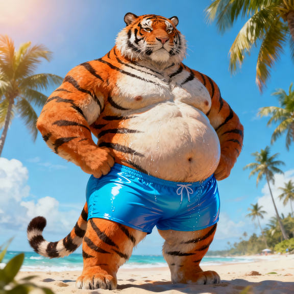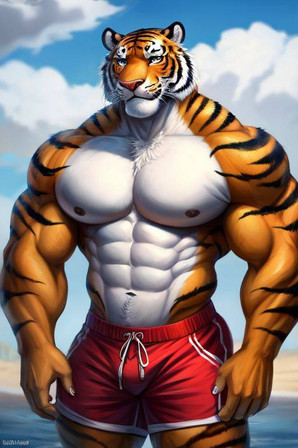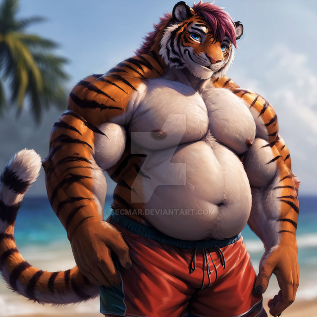 #beach #tiger #feline #furrymale #furry #muscle #anthropomorphic #chub #digitalart #furryanthro #male #stripes #swimsuit #tail #aiartwork