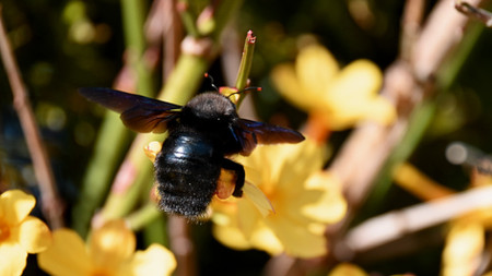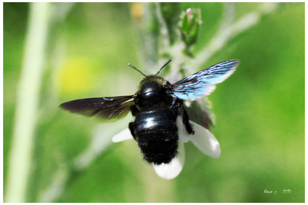 not just a bee, but a Carpenter bee, one of the largest bees you can find. Nice shot