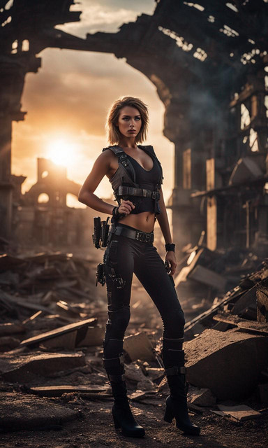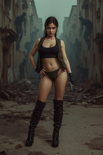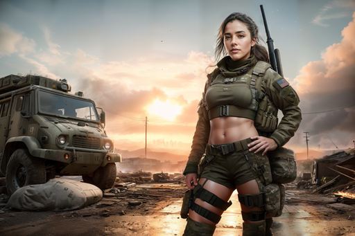 #ai #aigenerated #stablediffusion #armygirl #bellybutton #combatboots #croptop #hairbun #hotpants #postapocalyptic #overkneeboots