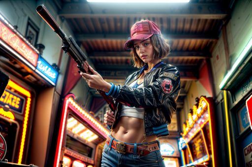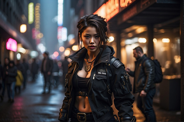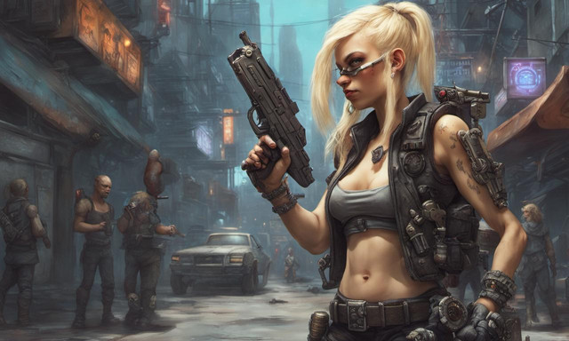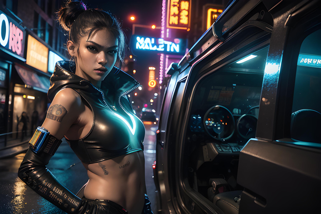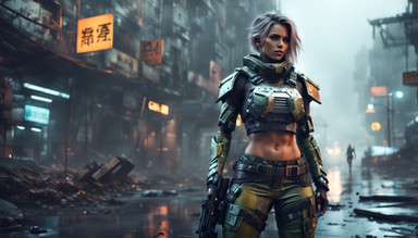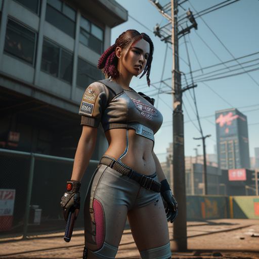 #croptop #warriror #ai #bellybutton #citylife #cyberpunk #gimp #gloves #hairbun #scificharacter #pauldrons #gimpphotoshop #aigenerated #stablediffusion