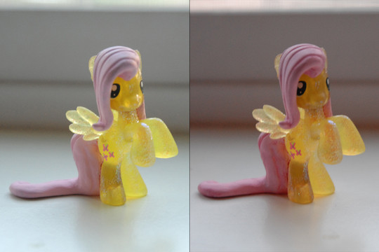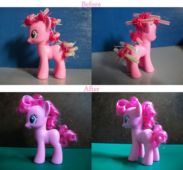 The before pic is pretty much right out of the box. After some work, I got her like this. Her tail needs some work and the frizzes are really hard to get rid of. But for a first go, not bad.