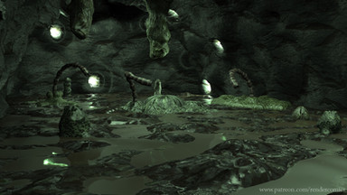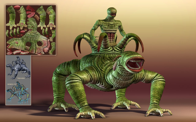 This is another fun material room experiment, again with an older set. The one in the foreground is my material work, while the one in the background is the original artist's mesh and maps. The shine is a bit high, but I chose that look (and can tweak) to highlight the warts and veins on the skin - all done procedureally. There is this mottled, subsurface, vein-y, blotchy look going on under that alien skin and it looks great. No new maps, just tweaks to shaders and a lot of under the skin stuff. The goal was to keep to original tone and look, but give them depth.Enjoy.