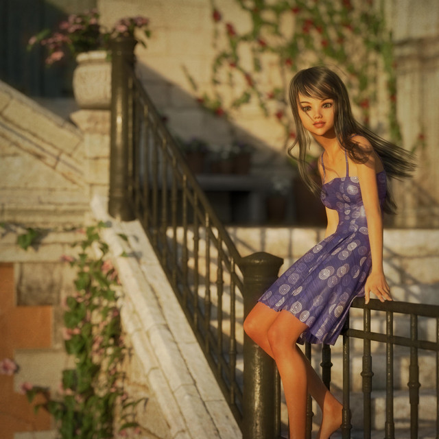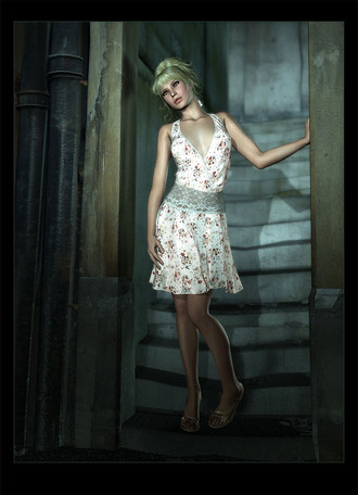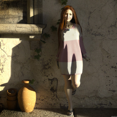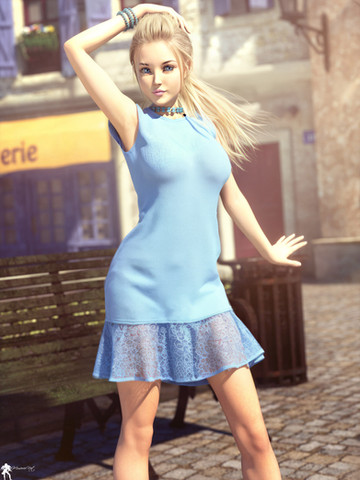 Ok this was just a quicky I rattled off while I was doing some writing. Think I got out 3k words while it happily ran in the background. One of the best things about this particular set I keep suing is it is really good on VRAM and does not force my local machine to CPU render, my GPU can manage it. That hair I reckon uses more with it's 8k textures. Whole scene was only about 3.5g texture memory.Anyway, I saw a promo image for this outfit earlier today and remembered I meant to buy it while it was on sale, so went and did that. The material has a bit of a vintage feel to it, so gave the image a similar treatment in post. It's yet one more Kaleya outfit in my library. It completely suits Erin's smaller petite frame and breast size.