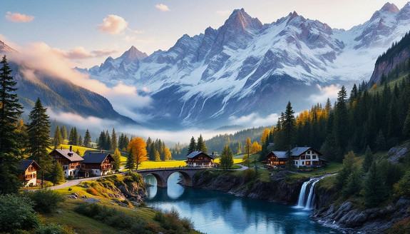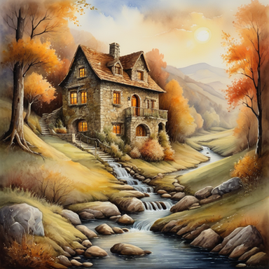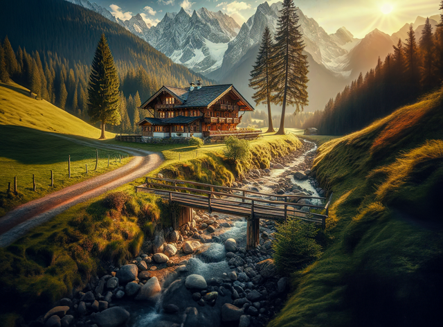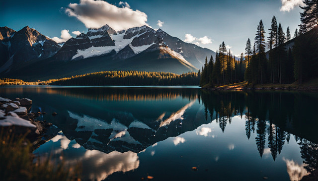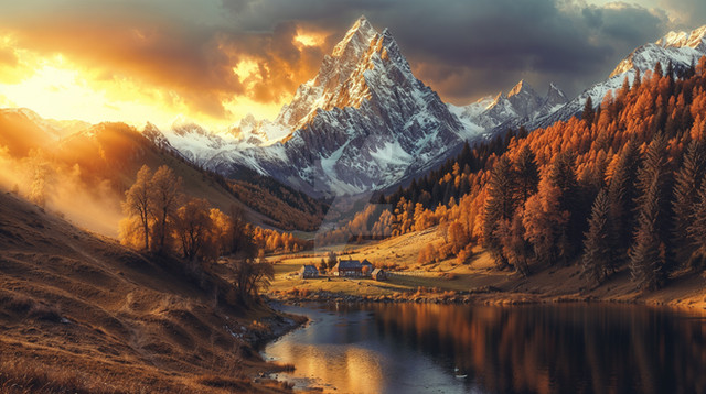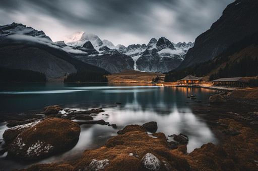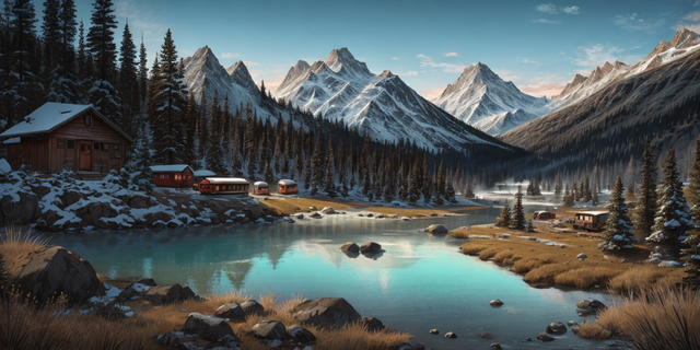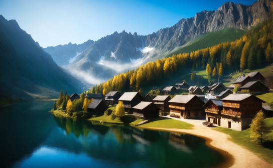 Cozy cottages line the shore of a pristine lake, surrounded by the majesty of a beautiful mountainside in the backdrop. The air is crisp, carrying the scent of pine trees and the faint hint of the lake's freshwater. The sun begins to set, casting a warm and golden glow across the landscape.created on rendernet.ai
