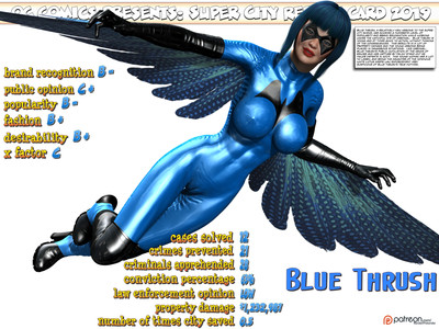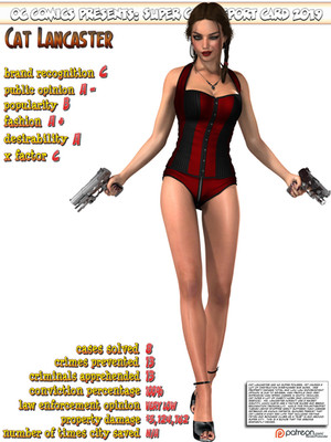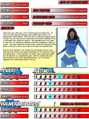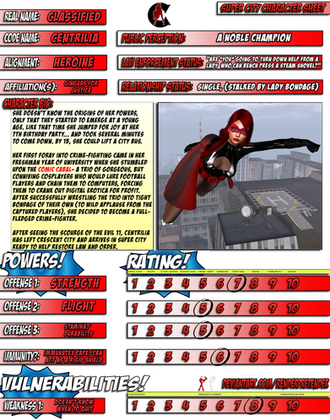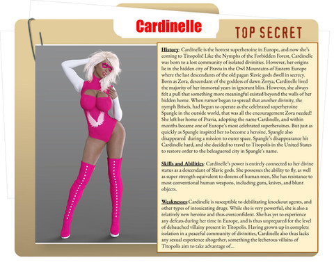 Ooh, this is fun. Nice variation on bios and other info pieces I like the categories, especially Property Damage. Cardinal looks excellent as always, just wodnering what's different. Maybe it would be easier to tell from front-on...different suit? Can't remember if that texture under her arms was there before.