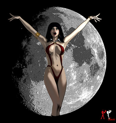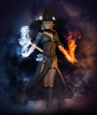 Ooh, awesome. I really like the hair swishing behind her, her green eyes and the cool special effects for the glowing weapons and flamey background
