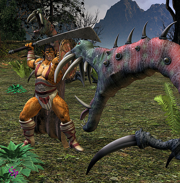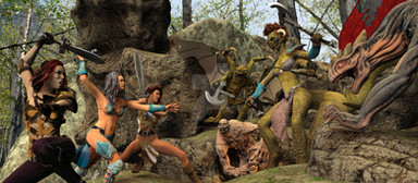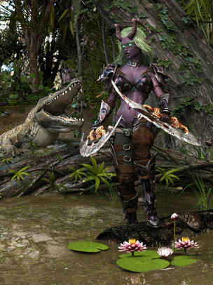 Caught off guard by the Lizardmen's ambush, Raziel found herself surrounded. She fought furiously, laying about her with her sword. One foe went down and then another, but one of the foul vermin caught her from behind with his bone club. It was a crude weapon by Elven standards, but it was enough. As she lay dazed on the ground the remaining scaly creatures closed in about her and quickly bound her wrists.