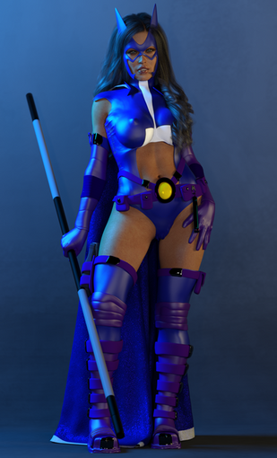 Very nice Having her mostly grey and white is great for making that lovely rich purple stand out. The folds on the cape look great and the gloves have come out especially well. Arranging the lighting so that the folds and seams are visible makes clothing items look so much more realistic or dynamic.