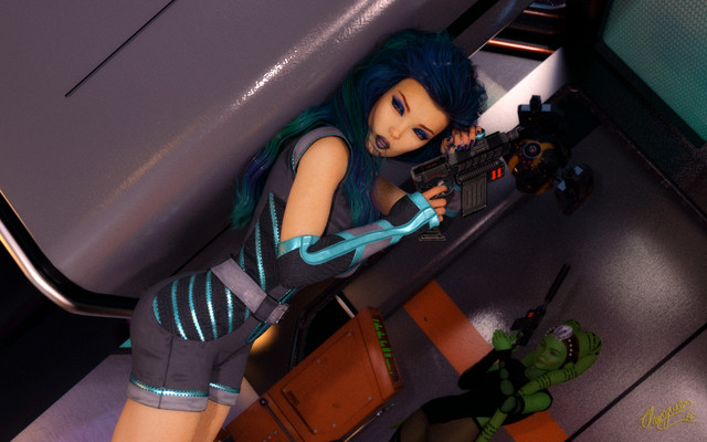 Erica looks good though I like the rugged look of the material of the clothing and boots, it goes nicely with the elegant blasters and the bright red beams from them.
