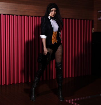 That's come out well, nice mix of different clothing textures: I especially like the top and gloves but the fishnets and hat go nicely with them. The hat's maybe a bit small but I don't know if altering the sizes of items works in your programme...anyway, she looks neat
