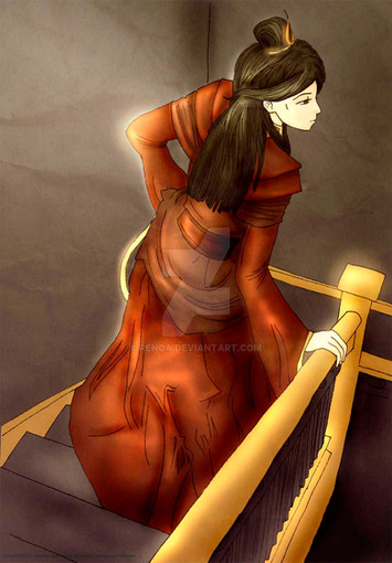 A scene from In Her Eyes [link]Mai in her Earth Kingdom togs from The Crossroads of Destiny. I like these clothes, personally. She hates them to pieces. >3