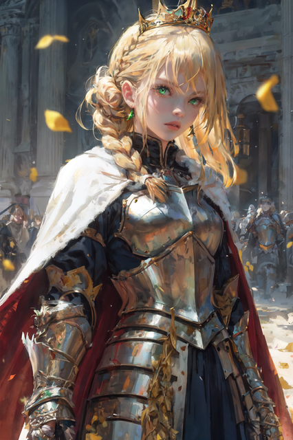 #ai #artwork #blondegirl #blondehair #braidedhair #braids #cape #crown #girl #girlportrait #girlwoman #greeneyes #knight #oilpainting #princess #ribbon #knightgirl #knightprincess #pauldrons #princessknight #aigirl #arttraditional #crownprincess #knightarmor #artworkdigital #greeeneyedgirl #aigeneratedart #aicommunity #stablediffusion #stablediffusionart