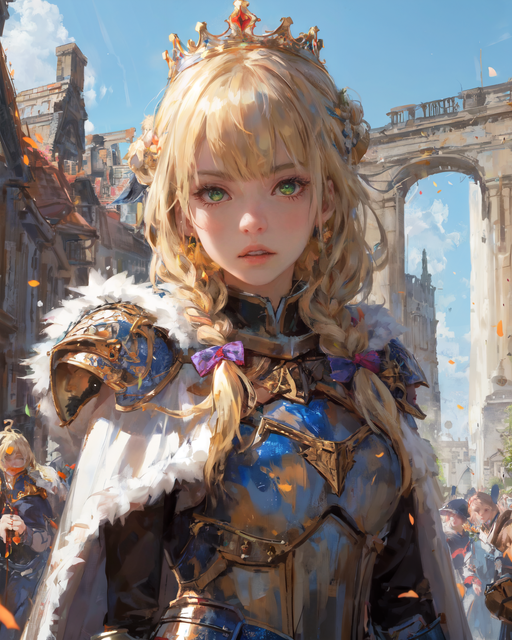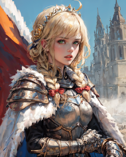 #ai #artwork #blondegirl #blondehair #braidedhair #braids #cape #crown #girl #girlportrait #girlwoman #greeneyes #knight #oilpainting #princess #ribbon #knightgirl #knightprincess #pauldrons #princessknight #aigirl #arttraditional #crownprincess #knightarmor #artworkdigital #greeeneyedgirl #aigeneratedart #aicommunity #stablediffusion #stablediffusionart