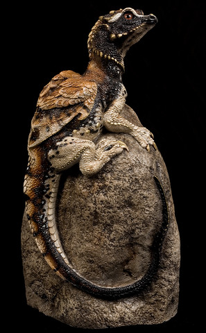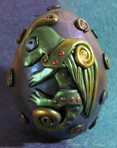 A llama hatching from an egg.We never produced this one. The casting is gypsum and the ears are cast pewter. He has glass eyes. The egg is a little bigger than an ostrich egg.Llamas seem popular around here.