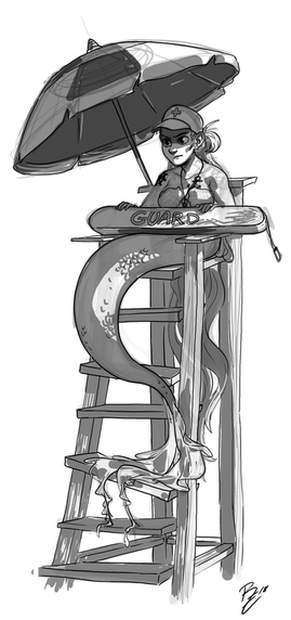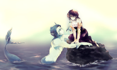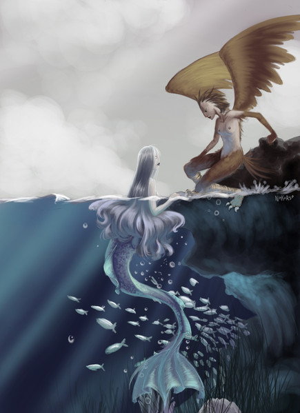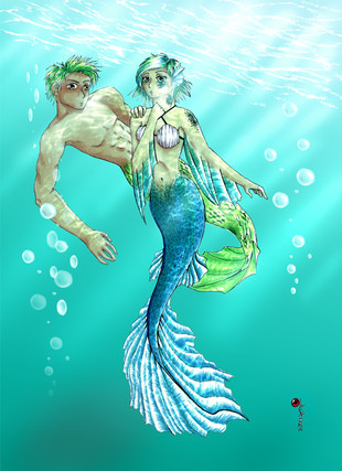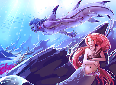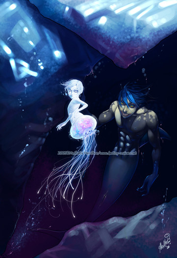 mmm the cave walls could've used some more detail. The water could use maybe some more realistic feeling to it, add in specks of dirt/algae floating in the water unless you intended it to be like really clean/clear water DD: other than that background stuff that I kinda suck at so I have no real room to be talking about, lol... this is awesome I do worry if her elbow is on his special place XDD though.. D;' where are fish-boy's special places anyway? XDDD errm ._.;;;