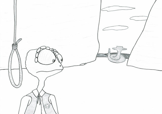 “Rango couldn’t believe his eyes. In bewilderment, he looked up to the old metal bow of the covered wagon. No, this couldn’t be true! But it was true. He saw it with his own eyes which or who was hanging on the metal bow. A rattlesnake.