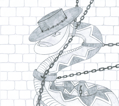 With that he grabbed Bill's jawbones. Shortly after the lizard tasted the familiar cloth in his mouth and the blindfold was tied around his eyes. Then he was forced to sit back against the pillar. The guard tied his hands together on it and left the room.
