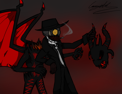 He is a gangster from around 1930s or 40s who is half scorpion, his main top set of arms are different from the rest because its suppose to represent claws, on the side of his pants hangs his tails like it is a chain.