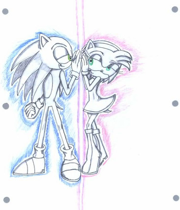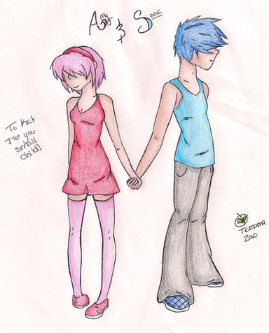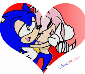 Then I thought, "What if Knuckles and Amy saw this little chain lying on a table and innocently decide to pick it up at the same time?" Knuckles would grab the red end, and Amy the pink one. As they gaze at each other, the little love chain hangs between them.