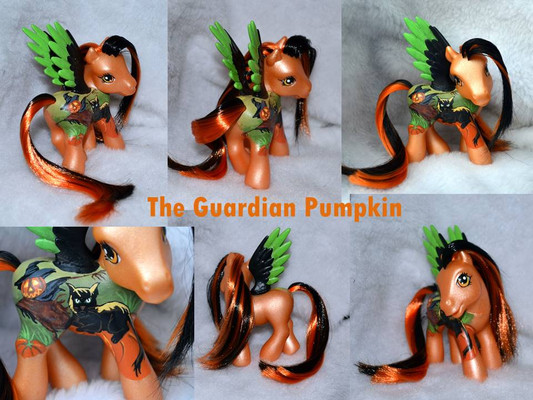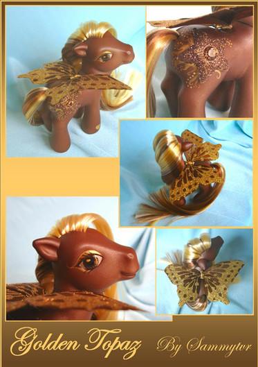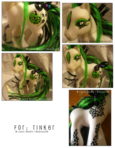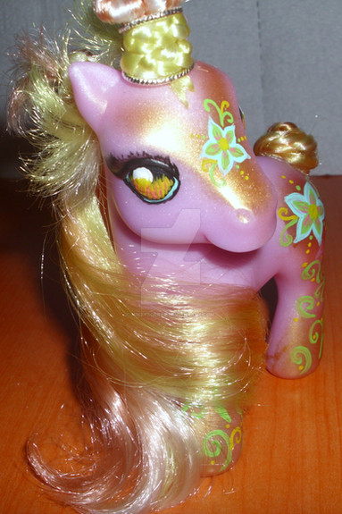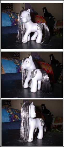 her base was a G3 butterscotch. she has been fully rehaired with CM Yellow and Nitro Lime Kat Silk Doll Hair from RestoreDoll.com. her hip mark is the deviantart.com logo with Jark, the yellow alien, and his probe. her hoof mark is jark with a little red heart. her eyes are now yellow and green, and she has her own probe and strap to hold it.the DA icon is (c) to it's creator, The Yellow Alien, Jark is (c) to Scott Jarkoff, Jark Support MLP design is (c) to me, christi m morgan