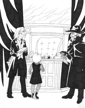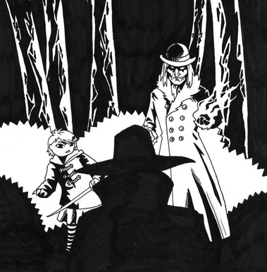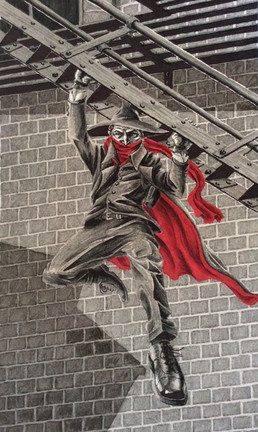 Uhhh... I just wanted to play with paint. Lots and lots of black paint. Whee! Randomly diagonal composition is due to the second window and decorative elements being fugly, so I blacked them out. Oh well.Not sure whether that's an Innocent Victim gasping a Vital Clew, or a Crook Who Had It Coming. You decide.