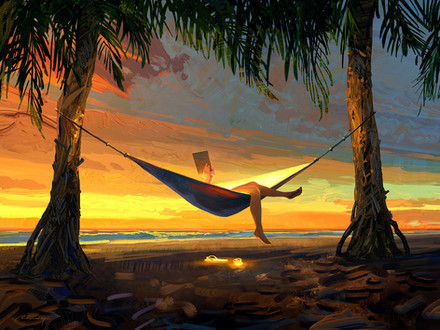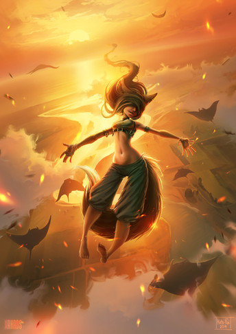Wow, I love the sunset light. She looks so liberated. I really like the manta rays flying there too.