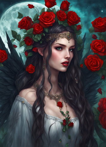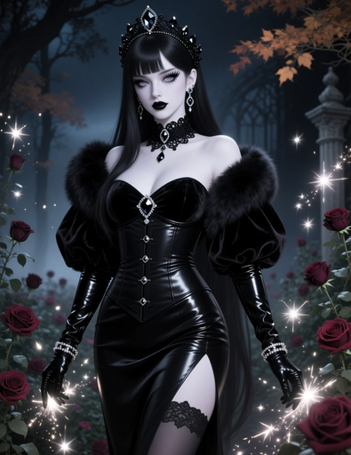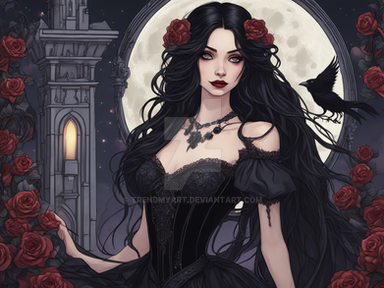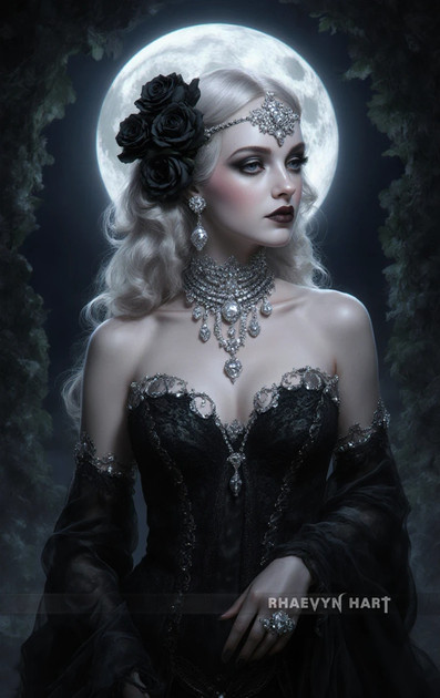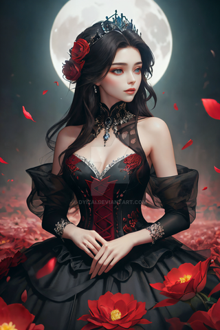 #digitalart #portrait #gothic #drama #characterdesign #beauty #black #blacklipstick #crown #dress #elegant #flowers #gown #jewelry #jewels #makeup #moon #paleskin #roses #tiara #white