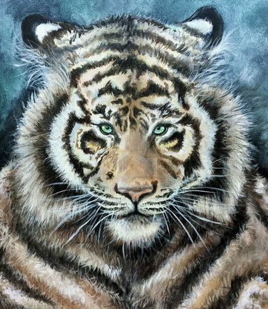 This is the first of 3 tiger paintings I'm making for an art exhibition this fall. The theme of this trilogy is Year of the Tiger, for 2022 and the energy of the tiger. The tiger stands for courage, bravery, power, strength, sovereignty, independence, leadership, wisdom, and tigers are regal, elegant, nimble, attentive and command respect and authority. No two tigers look the same, their stripes and marks make them unique.