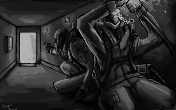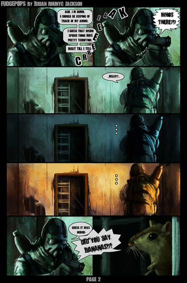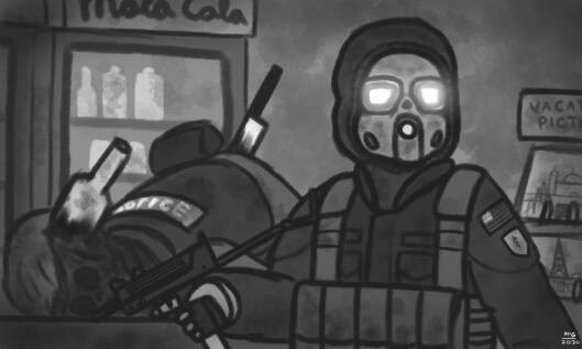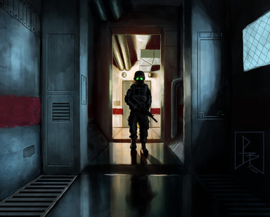 Started out as me painting a concept for a soldier in the universe I have on the backburner.. Really really liked how atmospheric I managed to make it look, then decided to fill up the empty space with speech bubbles....because laziness. So yeah.