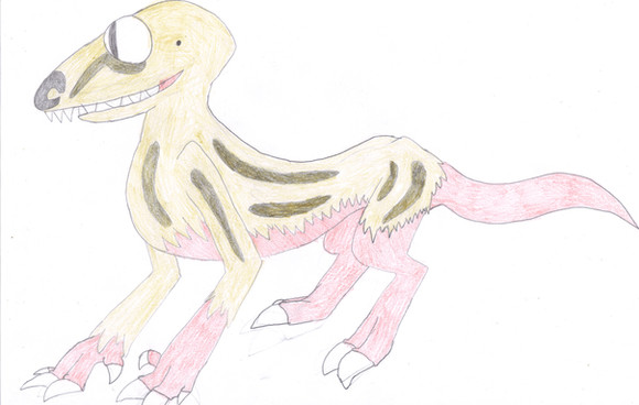 This is a Psyrap Rhinolip, which is a relative of the Uaieoa. Unlike the arboreal Uaieoa, they are cursorial predators. They have colourful fins and stripes, and also have a pair of chondricones, similar to a giraffe's horns. They use their lips to pick up and consume their food, as do all species in the Rhinolip family. Unlike the colour-changing Uaieoa and their relatives, the colourful areas have only one colour which can be reverted to a camoflagued colour, which can change from leaf-yellow to soil-brownThis is based on ZeeMendoza's Psychoraptor ( www.deviantart.com/zeemendoza/…)