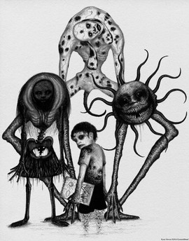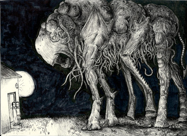 Ink illustration of something creepy and mysterious (hopefully!). I like the idea of something scary being obscured in shadow. To me, that mystery makes a creature much creepier than if it were well-lit and completely visible. At least I think so...Also, I like the idea of a child encountering some kind of monster, but being more curious than afraid. I think an adult seeing something like this would run away. But I like to imagine this kid is amazed and intrigued, rather than afraid.