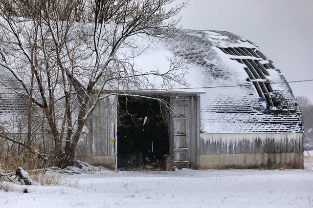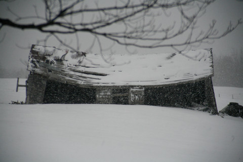Nice framing sis! I like the balance between the snowy branches and the dark opening of the barn's loft :-]