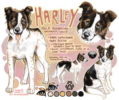 This is from 2018 and she's due for a new one soon! Her original design is by @/s-strawberrymilk on IG with some edits by me!Here's her toyhou.se for anyone who wants to take a look! toyhou.se/2714875.harlequin-ha…