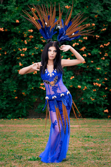 It's hauntingly mesmerising. I love the orange throughout - the feathers, the eye shadow, the bat on the bodice, and the blossoms on the tree in the background. The little skulls lining the neck and the waist are a terrific touch as well - so much vibrant color, and yet a small glimpse of something more sinister.