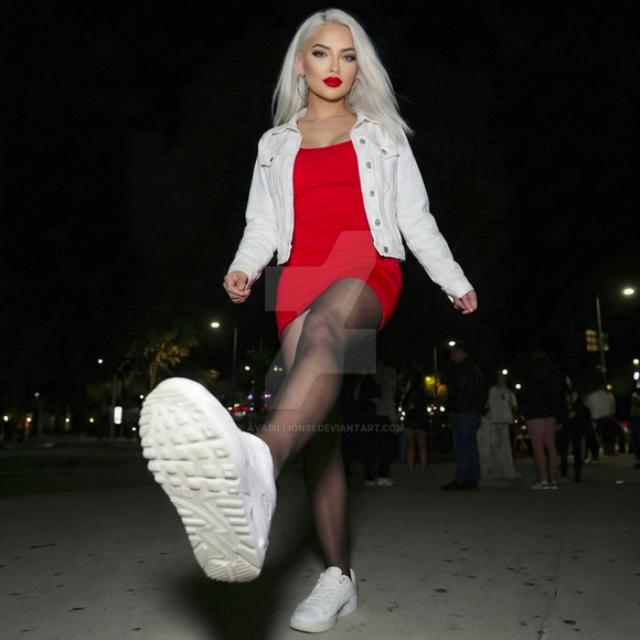 I like how the line of the railing make a strong divider of the image, and the model is at the end of that line. The choice of a white dress against the dark background makes a nice contrast. Her shoes the same way, although they may be a bit overkill for the scene. If I had to offer any improvements (in my opinion) to this shot: 1) have her look at the camera or straight forward, 2) bring back all the hair along her back, 3) slide her to the right five feet and chop the railing off so that you don't see the ends of the two round bars and square rail. She's a beautiful model, with great legs and skin. Nice work. -Mark